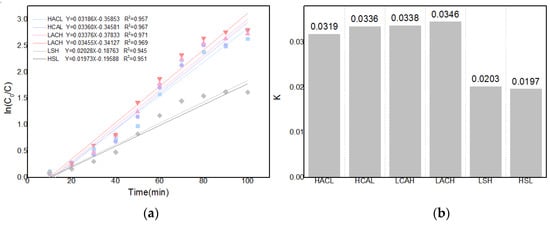 The integral method is one of the best methods to study reaction sequences and is used to evaluate first-order reactions when analyzing ln(c/c0) vs. time curves. Based on the concentration change curves at different temperatures (25 °C, 45 °C, 65 °C and 85 °C), the corresponding lnc vs. t curves can be obtained, as shown in Figure 14a. Further regression gives the corresponding k values. Drawing Figure 14b with lgk vs. 1/T gives a curve with a slope of E/2.303 R and an activation energy value of E. The activation energy is calculated from the slope to be 12.6 kJ/mol. The activation energy value indicates that the reaction is diffusion controlled and combined with the rule of thumb, can be determined to be diffusion controlled.