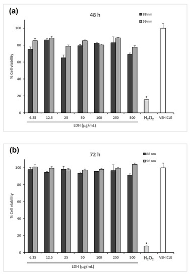 Cytotoxicity assessment of the LDHs synthesized. The effect of LDH on cell viability was determined by incubating 5 × 104 HEK293T cells with the respective treatment for (a) 48 h and (b) 72 h. Cell viability was determined with the resazurin assay. No difference in cell viability between the cells treated with the vehicle alone (PBS) and any of the LDH-treated samples was observed. In contrast, the addition of H2O2 resulted in a cell viability of less than 20%. The asterisk indicates statistically significant differences relative to the control.