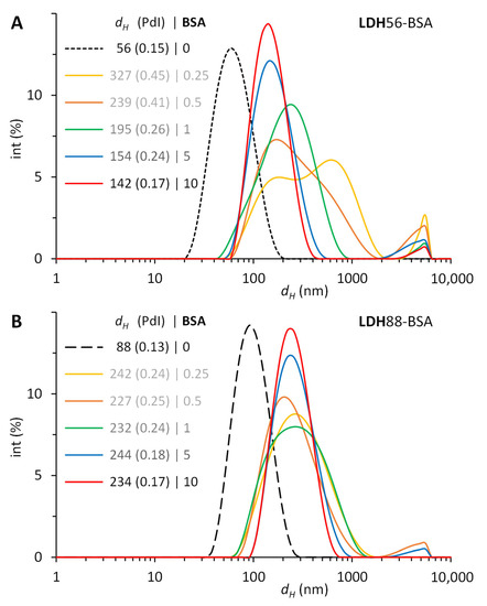 Size evolution of LDH–BSA after the physisorption of increasing amounts of BSA on LDH. Conjugates obtained by combining mass ratios of LDH–BSA from 1:0.25 to 1:10 during 24 h in a rotating mixer at 25 °C. Hydrodynamic diameter (dH) and polydispersity index (PdI) with DLS of conjugates with (A) LDH56 and (B) LDH88.