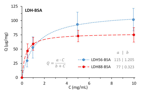 Two sizes of LDH were conjugated with BSA by passive adsorption to test five LDH–BSA mass ratios: 1:0.25, 1:0.5, 1:1, 1:5, and 1:10. The adsorption of BSA occurred at pH 5.7 for 24 h in a rotating mixer at 25 °C. Afterward, the LDH–BSA conjugates were washed three times by centrifuging for 45 min (smaller LDH) or 30 min (larger LDH) at 21,200× g and resuspending with PBS. These washings were performed to remove free BSA molecules, since the interest for vaccinology purposes is on protein molecules that are strongly adsorbed by the LDH surface. The concentration of BSA still adsorbed was determined using SDS-PAGE (releasing the protein from the nanoparticles) and analyzed with densitometry after staining. The BSA concentration that remained on the LDH surface (Q) was related to the BSA concentration in the liquid (C) that was calculated as the difference between the initial BSA concentration for adsorption (C0) and the BSA concentration determined using SDS-PAGE. The obtained data followed a Langmuir-style functionality; therefore, Equation (1) was used to model these data, where a and b are fitting parameters.