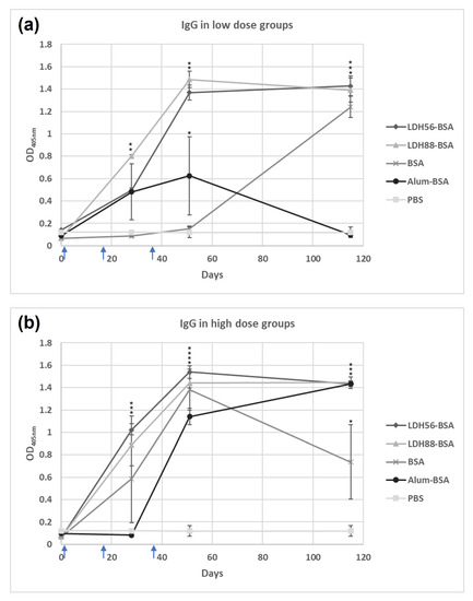 Evolution of IgG levels induced in mice against BSA. Mice groups were s.c. immunized on days 1, 14, and 35 (indicated with blue arrows). (a) Low-dose groups (1 μg of BSA) and (b) high-dose groups (5 μg of BSA). Serum anti-BSA antibody levels were determined on days 0, 28, 51, and 115 using test sera at a 1:3200 dilution. The asterisks (*, **, ***, ****) indicate statistically significant differences relative to the antibody levels of the PBS group.