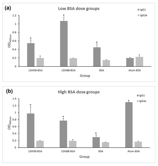 Analysis of the anti-BSA IgG subclass abundance in test mice. Mice groups were s.c. immunized on days 1, 14, and 35. Seric levels of anti-BSA IgG1 or IgG2a subclasses were determined on day 115 using test sera at a 1:3200 dilution. (a) Low-dose groups (1 μg of BSA) and (b) high-dose groups (5 μg of BSA). Anti-BSA IgG1 or IgG2 serum levels were determined with ELISA at a 1:3200 dilution. The asterisk indicates statistically significant differences relative to the IgG2a levels.