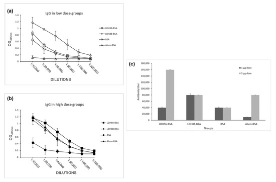 The protocols were performed according to the Guide for the Care and Use of Laboratory Animals of the National Institutes of Health (NIH, Bethesda, MD, USA), and these were approved by the Institutional Research and Teaching Committee of the Chemical Faculty at the University of San Luis Potosí, Mexico with Registration Number: CEID-2020-07-R1 (approval date: 26 August 2020). The test mice (BALB/c strain, 12-week-old) groups were randomly (n = 4) established and assigned to an immunization scheme. The scheme comprised three subcutaneous (s.c.) administrations of 200 μL on days 1, 14, and 35 of one of the following treatments: (1) LDH88–BSA, (2) LDH56–BSA, (3) BSA alone, (4) BSA with Al(OH)3 (Alum–BSA) at 1:5 v/v ratio, or (5) PBS alone. For all treatments, two doses were evaluated: a low (1 μg) or high dose (5 μg) of BSA. Blood samples were collected by tail puncture on days 0, 28, 51, and 115, sacrificing the mice on day 115. After clotting, the blood samples were centrifuged for 10 min at 1200× g, and the sera were separated and stored at −20 °C until further analysis.