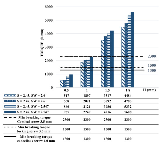 Different FE models were consequently developed to investigate the impact of the socket width (SW) and screwdriver width (S) on manufacturing tolerances in relation to screw head design for extracting stripped screw heads. Four different depth insertions (i.e., 0.5 mm, 1 mm, 1.5 mm, and 1.8 mm) were simulated by way of emulating real-life clinical surgical scenarios. It is noteworthy that during the process of bone healing, it is common for the socket to be filled with ingrown tissue, which can create a challenge where the screwdriver is unable to fully penetrate the socket’s depth. This condition can affect the stability and functionality of the bone screw. On the other hand, the findings of this study reveal that the impact of screwdriver depth on the maximum torque is more significant than variations in the width of the hexagonal socket (SW) and screwdriver (S). This suggests that adjusting the depth of the screwdriver has a greater influence on the maximum torque than modifying the dimensions of the hexagonal socket and screwdriver width. Therefore, it is recommended to ensure an appropriate depth of the screwdriver as a critical factor for achieving optimal torque and implant stability, even in cases where ingrown tissue might impede the complete insertion of the screwdriver into the socket. Highlighting the relative importance of screwdriver depth over SW and S width variations provides valuable insight in terms of considering the depth factor during surgical procedures and implant placement to optimize the biomechanical performance and long-term success of the implant. The effect of socket shape is another important factor [19] which was not the aim of the current study. We only explored the hexagonal socket shape here, as it is the most common design for screw heads [6,17]. Further work is recommended to explore innovative tools and techniques towards overcoming the challenges posed by ingrown tissue, ensuring effective engagement between the screwdriver and the socket and, ultimately, enhancing the overall outcome of orthopedic procedures.