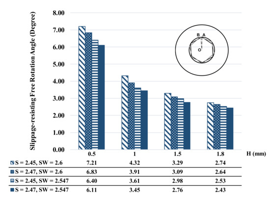 Comparison of the calculated slippage-resisting free rotation angle on different screw head socket and screwdriver design parameters.