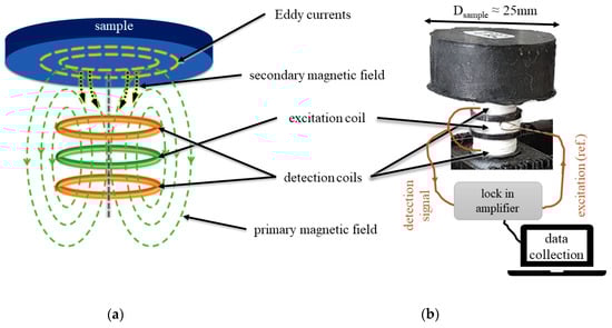 (a) Eddy-current differential coil system and (b) diagram of the performed measurement using the lock-in technique.