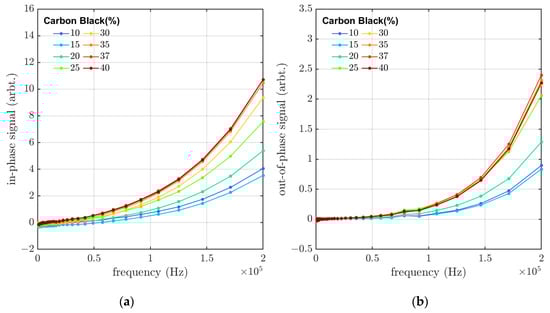 In Figure 2, we can see that both the in-phase and out-of-phase responses increase with higher frequencies. The induced voltage that creates the circulating eddy currents in the sample is proportional to the rate of change in the magnetic field with time (, where ϕ is the magnetic flux and t is time). As the frequency of the magnetic field increases, the rate of change in the magnetic field also becomes greater, resulting in a stronger induced eddy current in the samples. In this eddy-current sensing method, it is possible to induce eddy currents, both in individual carbon black particles as well as in larger diameter eddy-current loops when the carbon black particle concentration is high enough for the particles to form a network (in physical contact with each other) above the percolation threshold.