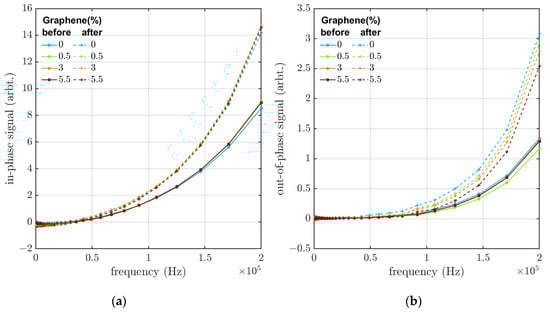 (a) In-phase and (b) out-of-phase eddy-current response versus frequency before and after aging using different graphene concentrations in the samples (with a CB concentration of 30 wt%).