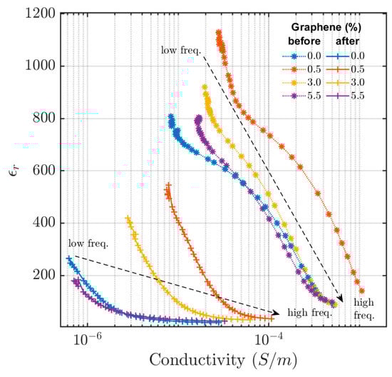 The in-phase permittivity versus electrical conductivity at different excitation frequencies is shown in Figure 4. Permittivity is inversely proportional to frequency, with the highest value of permittivity occurring at low frequencies and gradually falling with increased frequencies. The conductivity, on the other hand, is proportional to the frequency, lowest at the low frequencies and rising with an increasing frequency. A similar frequency dependence has also been observed in CB-reinforced styrene butadiene rubber [22]. As seen in Figure 4, the permittivity and conductivity of the samples significantly change after they are compressed and thermally aged. Contrary to the results from the eddy-current analysis, both the conductivity and permittivity decrease when the samples are thermally aged. Lower conductivity values after thermal aging of the rubber material containing carbon black have previously been observed [6]. This was explained by the debonding of polymer chains from the carbon black particle surfaces or the scission of polymer chains by means of oxidization or irradiation. This means changes in the interactions between the rubber matrix, CB particles, and graphene flakes have resulted in changes in conductivity.