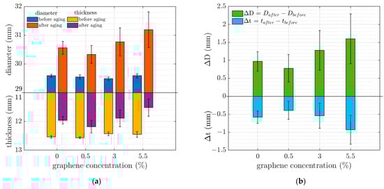 (a) Diameter and thickness of samples before and after aging and (b) variation in diameter and thickness of samples due to the aging process.