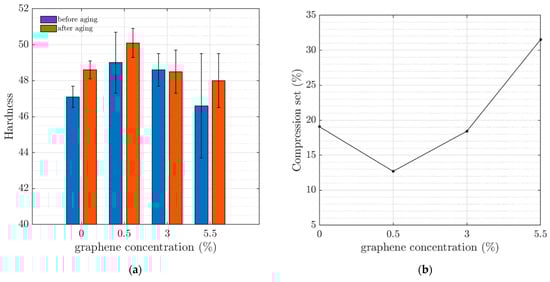 (a) Average and standard deviation (error bars) of the hardness measurements of the samples at different graphene concentrations before/after aging. (b) The compression set of samples as a function of the graphene concentration.