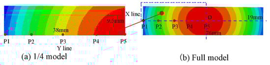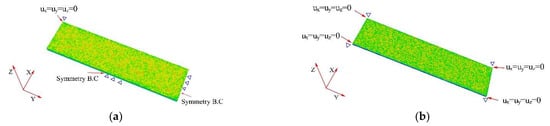 To reduce the analysis time, a quarter-symmetric Almen strip analysis model, as shown in Figure 2a, was used. The boundary conditions for the model were as follows: the endpoints were restrained in the x, y, and z directions (Ux = Uy = Uz = 0), and displacement was constrained in the direction perpendicular to the symmetry plane (Ux = 0, Uy = 0) [32]. To validate the quarter-symmetric analysis model, a full analysis model was also established and analyzed for comparison. The full analysis model, depicted in Figure 2b, had all four endpoints restrained in the x, y, and z directions (Ux = Uy = Uz = 0).