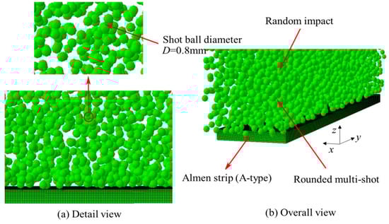The 3D discrete element analysis model with multi-shot random impact on the surface of the Almen strip. (a) detail view; (b) overall view.