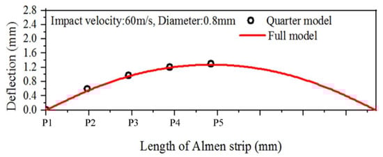Figure 4a shows the deformation of the 1/4 symmetry model and the full model of the Almen strip after multiple impacts. Figure 4b displays the deformation in the z-direction at points P1 to P5 along the length (y-direction) of the Almen strip, as indicated in Figure 4. P1 represents the endpoint in the length direction (y-direction) of the Almen strip, while P5 represents the central region along the length direction (y-direction) of the strip. The shot ball’s impact velocity was set at 60 m/s, and the impact time was 0.3 ms.