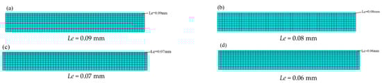 The minimum element sizes are 0.09 mm, 0.08 mm, 0.07 mm, 0.06 mm, and so on. These element sizes were used in Figure 6 to examine the convergence of the deformation measured at the center position of the Almen strip analysis model. In Figure 7, the average deformation obtained after analysis was approximately 1.314 mm, and all four element sizes provided values that were close to the average deformation. Considering the reduction in analysis time, a minimum element size (Le) of 0.09 mm was chosen.