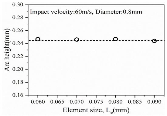 Figure 8 shows the deformations of the Almen strip in a 1/4 symmetric analysis model with a minimum element size (Le) of 0.09 mm after multiple shot balls impact randomly with velocities of 40 m/s, 50 m/s, 60 m/s, and 70 m/s for a duration of 0.3 ms. From Figure 8, it can be observed that the maximum deformations are 0.674 mm at an impact velocity of 40 m/s, 0.907 mm at 50 m/s, 1.306 mm at 60 m/s, and 1.407 mm at 70 m/s.