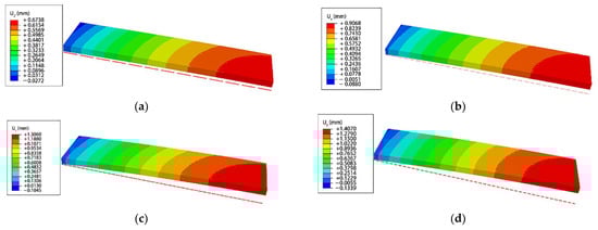 The deformation of the Almen strip in the z-direction, when (a) the peening velocity is 40 m/s; (b) the peening velocity is 50 m/s; (c) the peening velocity is 60 m/s; (d) the peening velocity is 70 m/s.