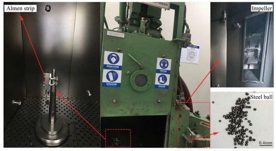 In order to validate the accuracy of the previously performed discrete-finite element (DE-FE) analysis based on the Almen intensity analysis model, an Almen intensity measurement experiment was conducted in this section. An impeller-type shot peening equipment was used in the experiment as shown in Figure 9, with a diameter of 250 mm. The rotation speed of the impeller was adjusted to achieve shot velocities ranging from 40 m/s to 70 m/s. The Almen strips used in the experiment were of type A, identical to the ones used in the analysis model. The shot used was a round-cut wire shot with an average diameter of 0.8 mm. The shot peening duration was set to 60 s, 120 s, 180 s, and 240 s, with a projection rate of 42 kg/min.