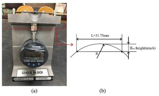 Figure 10 illustrates the process of measuring the deflection height of the curved Almen strip using the Almen gauge after shot peening. The Almen intensity is measured by placing the Almen strip on the upper surface of the Almen gauge and using a dial gauge to measure the deflection height within the 31.75 mm span (L) of the gauge [32,35].