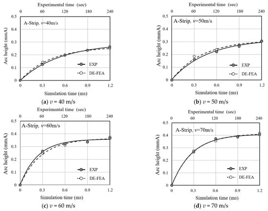 Arc height of the Almen strip at different impact velocities (a) with an impact velocity of 40 m/s; (b) with an impact velocity of 50 m/s; (c) with an impact velocity of 60 m/s; (d) with an impact velocity of 70 m/s.