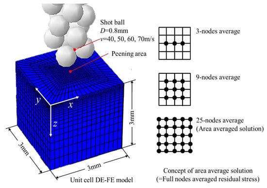 - Kim, T.; Lee, J.H.; Lee, H.; Cheong, S.K. An area-average approach to peening residual stress under multi-impacts using a three-dimensional symmetry-cell finite element model with plastic shots. Mater. Des. 2010, 31, 50–59. [Google Scholar] [CrossRef]