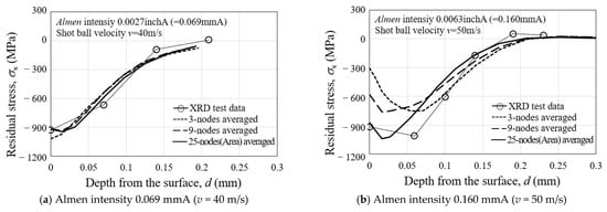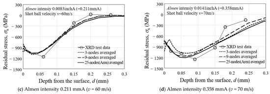 In order to validate the effectiveness of the proposed unit cell analysis model shown in Figure 12, an analysis of multiple random peening residual stresses was performed, considering the actual measured Almen intensity. The analysis considered the average over the evaluation regions, which refers to the multi-node average for the three evaluation regions shown in Figure 12. After the analysis, the obtained peening residual stresses were compared with the experimentally measured residual stresses by XRD in the depth direction from the surface of specimens peened with four different Almen intensities [39] in Figure 13. In case (a), the Almen intensity is 0.0027 inchA (=0.06858 mmA), and the impact velocity is 40 m/s, with an analytical peening time of 0.13188 ms. After the analysis, it can be observed that both the 9-point and 25-point averaged solutions are closer to the XRD experimental residual stress than the 3-point one. Case (a) represents the scenario where the maximum compressive residual stress occurs at the surface. Considering both the surface and maximum compressive residual stress, the 25-point average solution is slightly closer to the XRD experimental results than the 9-point average solution. In case (b), the Almen intensity is 0.0063 inchA (=0.16002 mmA), and the impact velocity is 50 m/s, with an analytical peening time of 0.25949 ms. After the analysis, it is observed that the 25-point averaged solution is closer to the XRD experimental residual stress than the 3-point and 9-point averaged solutions. In case (c), the Almen intensity is 0.0083 inchA (=0.21082 mmA), and the impact velocity is 60 m/s, with an analytical peening time of 0.25502 ms. After the analysis, it is found that the 3-point, 9-point, and 25-point averaged solutions are close to the XRD experimental residual stress. In case (d), the Almen intensity is 0.0141 inchA (=0.35814 mmA), and the impact velocity is 70 m/s, with an analytical peening time of 0.60531 ms. After the analysis, it is observed that both the 9-point and 25-point averaged solutions are close to the XRD experimental residual stress, but the 25-point average solution is closer to the XRD experimental residual stress at different depths. Overall, based on the comparison with XRD experimental residual stress [39], the 25-point averaged solution is found to be more effective in all cases. Based on the results shown in Figure 13, the discrete-finite element model that incorporates the actual Almen intensity and provides the 25-point averaged solution is chosen as the optimal peening analysis model.
