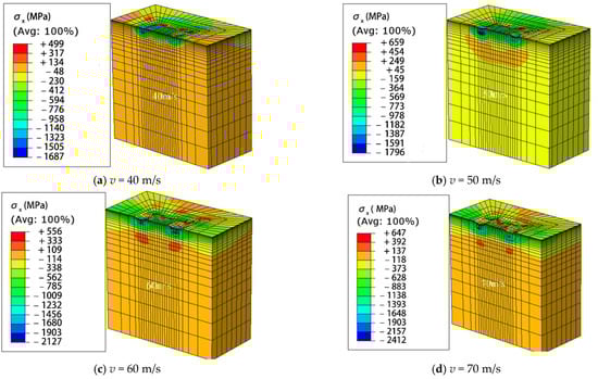 Figure 12 represents a DE-FE multi-random impact unit cell analysis model used to predict residual stresses induced in the metal material after actual shot peening processes. The model is capable of representing the entire surface area. The material used in the model is AISI4340, with dimensions of 1 mm × 1 mm × 3 mm. The same constant probability density function and Johnson–Cook model, as introduced in Section 2, were applied to the Almen strip analysis models. The shot ball model reflects a diameter of 0.8 mm and a density of 7800 kg/m3, assuming it is an undeformed rigid body. These shot balls impact at a 90° angle, with impact velocities of 40 m/s, 50 m/s, 60 m/s, and 70 m/s. Contact or impacts between the shot balls are not considered. Table 4 presents the mechanical properties and constant values for the AISI 4340 material and the shot balls.