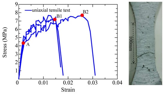 As demonstrated in Figure 1, the initial tension strength of the SHCC material is 4.2 MPa at point A, and the ultimate tensile strengths with a lower limit and an upper limit, is 7 MPa and 8 MPa at points B1 and B2, respectively, corresponding to the hardening strains of 1.5% and 2.2%. In all of the specimens, the initial cracks firstly appear at the initial tension strength at point A, and then the multiple fine cracks with significant strain hardening behavior occur and propagate until the ultimate tension strength at points B1 or B2. Thereafter, the stress decreases due to the localization of the multi-fine cracks.