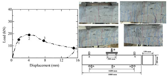 Figure 2 shows the load-displacement curve and crack propagation pattern of the SHCC member in flexural failure, in which the geometry of the experimental specimen is 1800 mm long with a cross-section of 150 mm × 200 mm. Moreover, there are no stirrups and longitudinal reinforcements arranged in the SHCC member. The specimen is loaded under a four-point bending setup, the displacements and load are measured using displacement transducers and a load cell, respectively, which are marked as A and B, respectively. The range of the load cell is 300 kN, with 0.1 kN sensitivity, and that of the displacement transducer is 25 mm with 0.002 mm sensitivity. During the experiment, the displacement transducer is required to be adjusted when the displacement is larger than 25 mm.