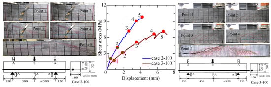 In the crack propagation pattern of case 3-100, it can be easily seen that this specimen shows similar crack propagation behavior to that of case 2-100. The flexural multi-fine cracks first occur at point 1 (a lower load level with a 1.7 MPa shear stress), then the multiple fine cracks occur in the middle of the shear span, in which the multiple fine cracks in the shear direction are increased and play a dominant role in increasing the shear stress from 3.3 MPa to 6.7 MPa (point 2 to 4). Thereafter, the localization of some multiple fine cracks occurs until the peak load with a 7.0 MPa shear stress (point 5), and the specimen is fractured in shear failure, in which the shear angle of the multiple fine cracks between the diagonal shear direction and the axial direction is about 28°.