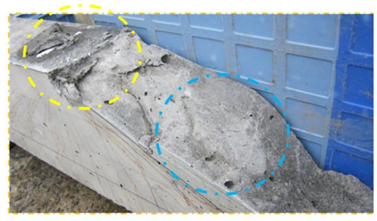 Figure 4 shows the fracture surface of the SHCC member in shear failure. It can be seen that the area near the loading point (yellow line area) is collapsed and the rest of the area (blue line area) is very smooth, whereas the fracture surface of normal concrete is quite rough. Hence, the fracture surface of the SHCC member is different from that of normal concrete. In order to understand the shear failure of SHCC, the fracture surface of the shear-failed SHCC member is surveyed.