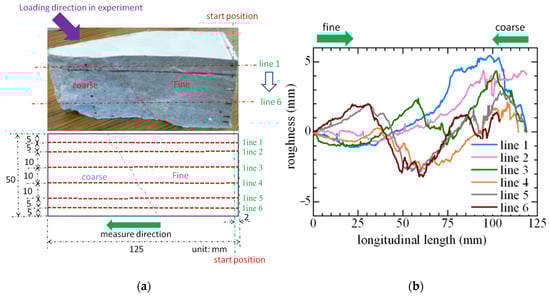 Figure 5 demonstrates the investigated roughness of the fracture surface in the shear-failed SHCC member, in which the sample is obtained from the coarse area near the loading point of the tested specimens. The sample length in the longitudinal direction is 125 mm, and the measured length is 123 mm, since the starting position for measurement has a distance of 2 mm from the side. The sample surface is measured using a laser displacement meter, which is implemented along the six dotted red lines, as marked in Figure 5, and six series of roughness (line 1 to line 6) along the dotted red lines are obtained.