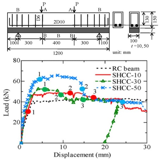 Figure 6 shows the load-displacement curves of the SHCC layer strengthening the RC member in flexural failure, in which the tested specimens are loaded under a four-point bending setup. In the experiment, the RC beam is the control beam, and the cases SHCC-10, SHCC-30, and SHCC-50 represent RC beams strengthened by the SHCC layer with different thicknesses of 10 mm, 30 mm, and 50 mm, respectively [25]. The load is measured by a load cell, and the displacements at loading points and supporting points, as well as a middle point, are measured by displacement transducers, which are marked as A and B, respectively.