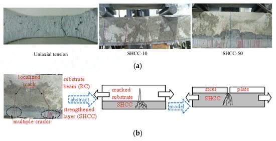 Cracking behavior of the SHCC layer used for RC flexural strengthening. (a) Crack patterns of the SHCC material and the SHCC layer used for flexural strengthening. (b) Concept of the zero-span tensile test.