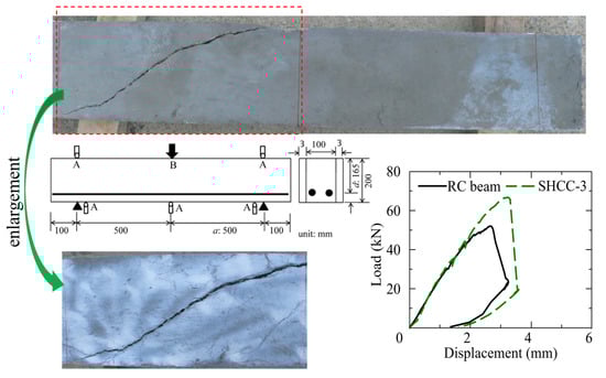 Figure 9 shows the load-displacement curves and the crack distributions of the RC member with shear strengthening using the SHCC layer, in which the ratios of the shear span length to the effective depth of all the specimens are 3. The RC beam is the control beam [28], and the case SHCC-3 represents the RC beam strengthened by a 3-mm thick SHCC layer on both sides. Both the RC beam and SHCC-3 have a 1200-mm length and a 100 mm × 200 mm cross-section, in which there are no web reinforcements, and two 10-mm-diameter deformed bars are arranged along the longitudinal direction. In the case of SHCC-3, both side surfaces of the RC beams are roughed by washing out using a retarder, which are adopted as the interfaces of the RC member and the SHCC strengthening layers; the SHCC layers are cast at both sides of the RC beam thereafter. In the experiment, the specimens are loaded under a four-point bending setup; the displacements at the loading points and the support point, as well as the middle point, are measured by displacement transducers, and the load is measured by a load cell, which are marked as A and B, respectively.