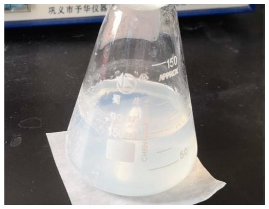 AlOOH sol with high purity, large specific surface area, and a uniform particle size distribution was obtained via hydrolysis of aluminum isopropoxide using the sol–gel method [12,13]. As a solvent, ultrapure water and anhydrous ethanol were mixed at a volume ratio of 15:1, heated in a water bath at 85 °C, and then aluminum isopropoxide to water at a molar ratio of 1:75 was slowly added into the solvent in the water bath for hydrolysis. After 1.5 h of condensation reflux, a certain proportion of nitric acid was added to adjust the pH, and then condensation reflux was continued for 1 h to obtain a uniform and stable opalescent AlOOH sol, as shown in Figure 1.