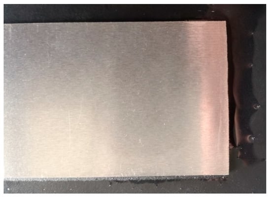 After successfully prefabricating and activating the polished surface of the nodular cast iron (about 20 min after spraying), a GWLASER 6 kw fiber laser cladding system was used for the laser melting experiments. The optimal parameters were obtained by measuring the overlap amount. The optimized parameters were as follows: 470 W laser power, 5.5 mm/s scanning speed, and 30% overlapping ratio. The control group was obtained by laser remelting the polished surface under the same conditions. Due to the low laser power and high laser reflectivity of the polished surface, the control group could not form a molten pool, as shown in Figure 4.