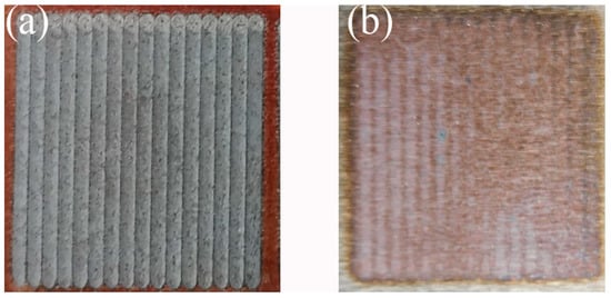 Figure 4. Macromorphology after laser surface treatment. (a) The prefabricated laser-melted surface; (b) the laser-remelted surface.