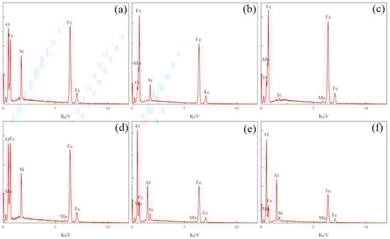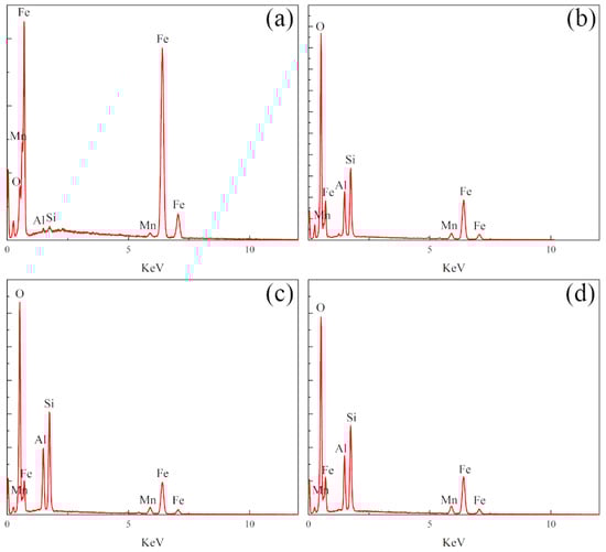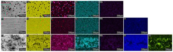 Three kinds of samples were prepared into block samples (10 × 10 × 5 mm) of an exact specification via wire cutting. By setting the SEM to a magnification of ×200, the EDS was used to scan the surface of the selected area and eliminated interference from trace elements, as shown in Figure 5. It was found that the substrate surface of the nodular cast iron mainly contained four elements, namely, Fe, C, Si, and Mn. Among them, C was primarily concentrated near the graphite balls, while the other elements were evenly distributed away from the graphite balls. Compared with the substrate surface, the laser-remelted surface had a lower C content and a higher O content, and the five main elements were evenly distributed on the surface. The O, C, Si, Mn, and Al contents on the prefabricated laser-melted surface increased significantly compared with those on the laser remelting surface. At the same time, the content of Fe decreased, in which O, C, Si, Mn, and Al were enriched considerably near the crescent top. XRD was used to characterize the phases on the surfaces of the three samples. The XRD patterns were obtained, as shown in Figure 6. The substrate surface showed an Fe phase with a slightly shifted diffraction peak. Compared with the substrate surface, the laser-remelted surface showed a small number of impurity peaks, and the diffraction peak shift disappeared, indicating a relatively standard Fe phase. The prefabricated laser-melted surface differed significantly from the first two, presenting a complex phase. According to the element distribution obtained by the EDS, it can be inferred that the surface shows a mixed phase with Al2O3, Fe3O4, and silicon dioxide (SiO2) as the main body.