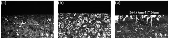Figure 13. Surface morphology of samples after thermal shock. (a) Substrate surface; (b) laser-remelted surface; (c) prefabricated laser-melted surface.