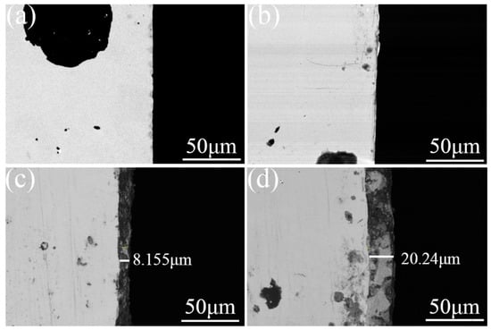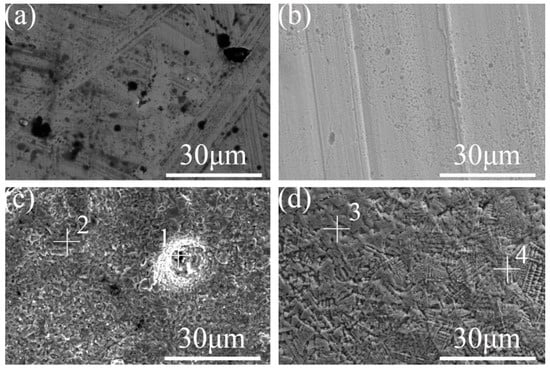 Figure 8. Backscattered electron imaging of section. (a) The substrate surface; (b) the laser-remelted surface; (c) the lap joint of the prefabricated laser-melted surface; (d) the crescent top of the prefabricated laser-melted surface.