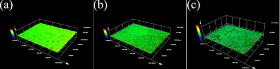 Figure 9. Surface 3D morphology. (a) Substrate surface; (b) laser-remelted surface; (c) prefabricated laser-melted surface.