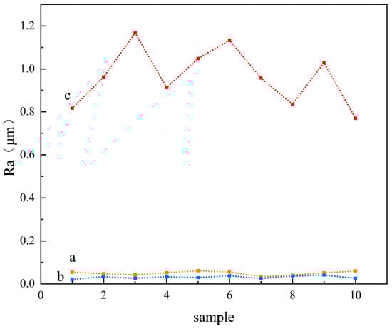 Figure 10. Surface line roughness (Ra) in the vertical laser treatment direction. (a) Substrate surface; (b) laser-remelted surface; (c) prefabricated laser-melted surface.