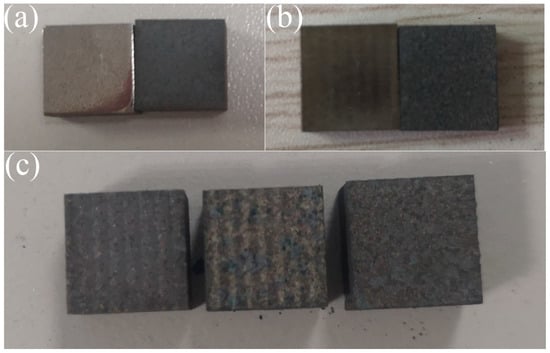 After the AlOOH sol was cooled, it was evenly sprayed with a thickness of 0.3 mm onto the surface of the polished nodular cast iron blocks with ferrite matrix, as shown in Figure 2. The blocks were then left undisturbed to allow the prefabricated activation film to activate the surface. According to research by Li Lei et al., it was found that an acidic activation solution containing nitrate ions would form active ferrous nitrate and ferric nitrate activation films with Fe2+ and Fe3+ ions on the steel surface [10]; the surface of the nodular cast iron changed color over time from silver white to yellow–brown, as shown in Figure 3.