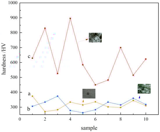 Figure 14. Microhardness and indentation size. (a) Substrate surface; (b) laser-remelted surface; (c) prefabricated laser-melted surface.