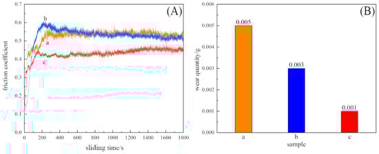 Figure 15. Variation in friction coefficient with time (A) and wear quantity (B). (a) The substrate surface; (b) laser-remelted surface; (c) prefabricated laser-melted surface.