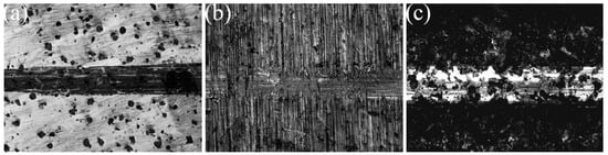 Figure 17. Wear micromorphology under SEM. (a) Substrate surface; (b) laser-remelted surface; (c) prefabricated laser-melted surface.