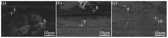 The surface wear resistance of the three samples was characterized, and the real-time friction coefficient as well as the mass wear amount after the experiment were measured, as shown in Figure 15. The friction coefficient of the laser-remelted surface and the polished surface of the nodular cast iron showed little difference, with both being around 0.5280, and the volume loss decreased from 0.005 g to 0.003 g. The prefabricated laser-melted surface reduced the friction coefficient to 0.4370 and the volume loss to 0.001 g, significantly improving the wear resistance. A laser confocal microscope was used to observe the overall morphology of the three kinds of wear traces, as shown in Figure 16. SEM was used to magnify the internal morphology of the wear traces at 8000 times magnification, as shown in Figure 17. It was seen that there is no furrow inside the wear traces of the nodular cast iron, but that there are pits and two different degrees of contrast simultaneously. Furthermore, there are conspicuous furrows and holes in the wear trace of the laser remelting as well as two different contrast degrees. Moreover, less apparent furrows and very obvious layered protrusions inside the laser melting grinding marks, without any pits, can be seen, with two areas of different contrast degrees present. An energy spectrum dot analysis was carried out for places with different contrasts, as shown in Figure 18. The results show that the difference in element content at points 5 and 6 is mainly reflected by the difference in the proportion of O. The difference in element contents between points 7 and 8 is also primarily reflected by the difference in the O and Si content ratio. The element content difference between points 9 and 10 is minimal.