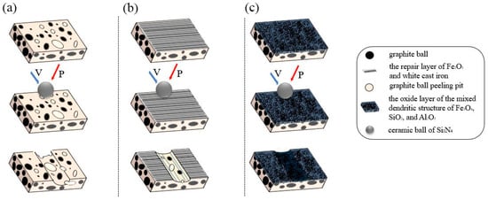Figure 19. Schematic diagram of the wear mechanism of the surface. (a) Substrate surface; (b) laser-remelted surface; (c) prefabricated laser-melted surface.