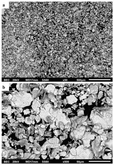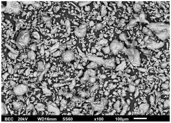 The aluminium powder that was used as the composites’ matrix phase is presented in Figure 1. It can be observed that, despite the fact that the powder was produced by atomisation, its shape is of an elliptical/ligament-like morphology rather than spherical. What is also important to mention is that the size of the particles covers a wide range from 1–10 μm up to 100–150 μm.